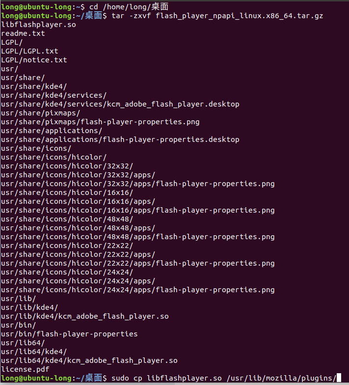 4、使用命令 tar -zxvf install_flash_player_"version"_linux."processor".tar.gz 從您下載的文件中抽取 libflashplayer.so。