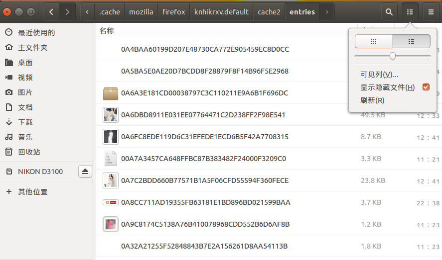 2、發(fā)現(xiàn).cache目錄占用不少磁盤空間,因?yàn)樵趗buntu中以“.”開(kāi)頭的都是隱藏文件,所以得在文件管理器中先勾選“顯示隱藏文件”,如下: