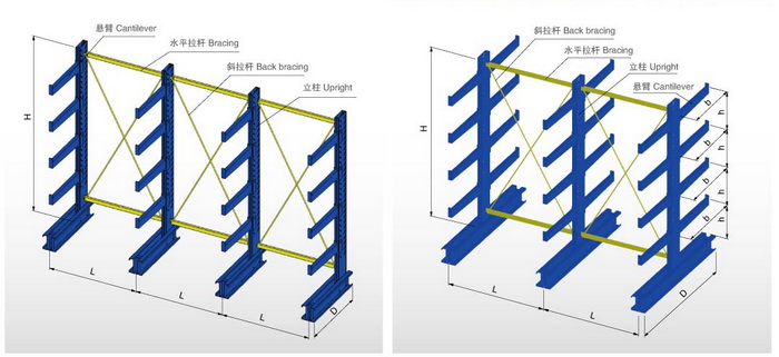 懸臂式貨架是貨架中重要的一種。立柱多采用H型鋼或冷軋型鋼,懸臂采用方管、冷軋型鋼或H型鋼,懸臂與立柱間采用插接式或螺栓連接式,底座與立柱間采用螺栓連接式,底座采用冷軋型鋼或H型鋼。