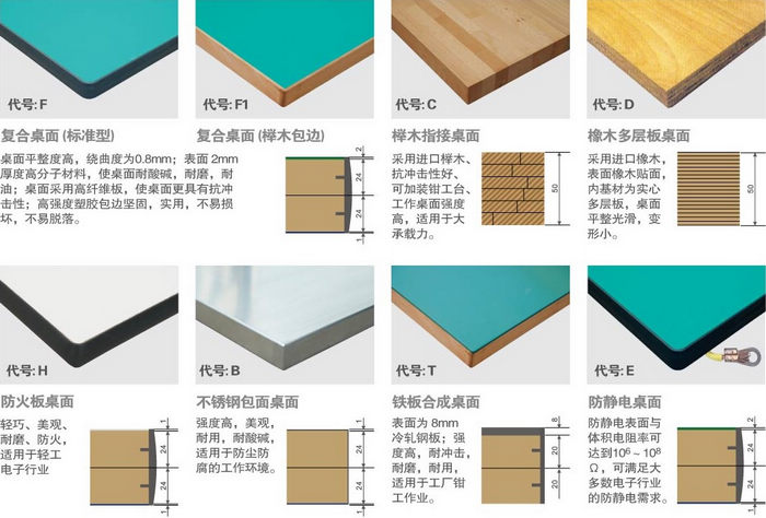 工作桌可供多種臺面選擇,以此來適應不同的場合,因此也出現了以臺面的不同來進行對工作桌的分類,比如防靜電、防火、防塵防腐等特殊的特性。