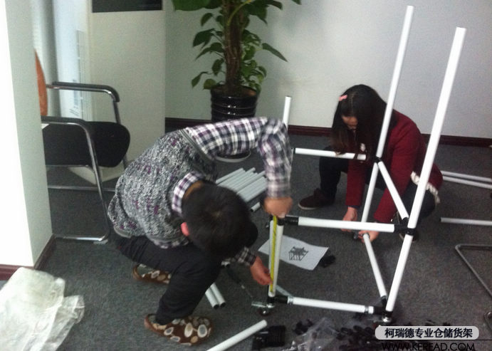 今天,柯瑞德蘇州貨架公司突然運來一批線棒,大家手把手搬到大會議室,拆開拿出圖紙一看,原來是個線棒手推車,看著這一地的零配件,阿杜和小符想著,自己試著搭吧!經理也允許了,在旁邊指導著。