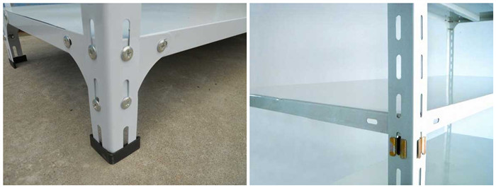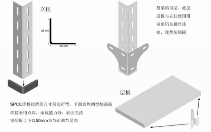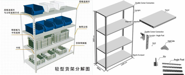 2、角鋼貨架由等邊角鋼立柱、層板、角碼、卡銷、專用螺栓和塑料底腳組成。