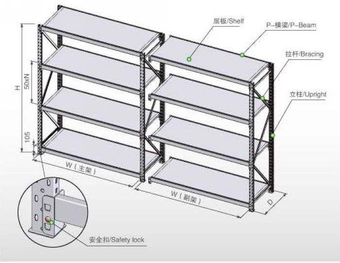 中B型貨架由柱片、橫梁、橫撐、斜撐以及自鎖螺栓組裝而成,可以有效防止螺栓松動后引發貨架失穩;橫梁采用特制的冷軋P型閉口梁。柱卡與立柱連接時配有特殊設計安全銷,可以確保橫梁在外力撞擊下不會脫落;層板采用國際流行的條狀層板,層板的厚度,加強筋的數量決定層載要求。