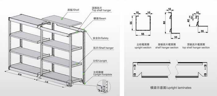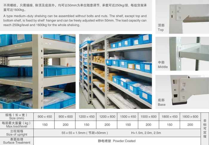 中A貨架是中型貨架系列中常用的一種,由立柱、橫梁、寬掛、窄掛、防脫鎖聯(lián)接而成。最上層與最下層層板為固定式,中間任一塊層板可調(diào)節(jié),節(jié)距為50mm,可以使客戶根據(jù)貨物的體積大小來調(diào)節(jié)間距。