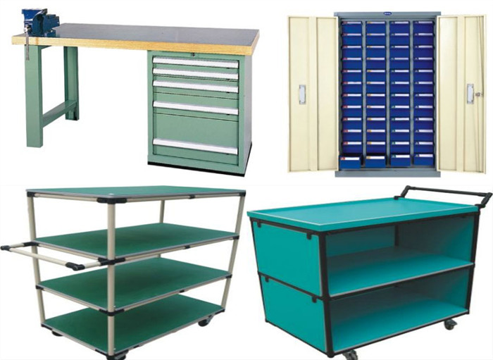 常用的工位器具主要包括:工作桌、零件整理柜、分裝臺(架)、料箱、料斗、集配箱、運轉小車等。