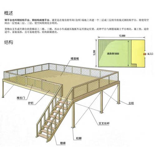 鋼平臺由平臺結構通常由鋪板、主次梁、柱、柱間支撐,以及梯子、欄桿等組成。